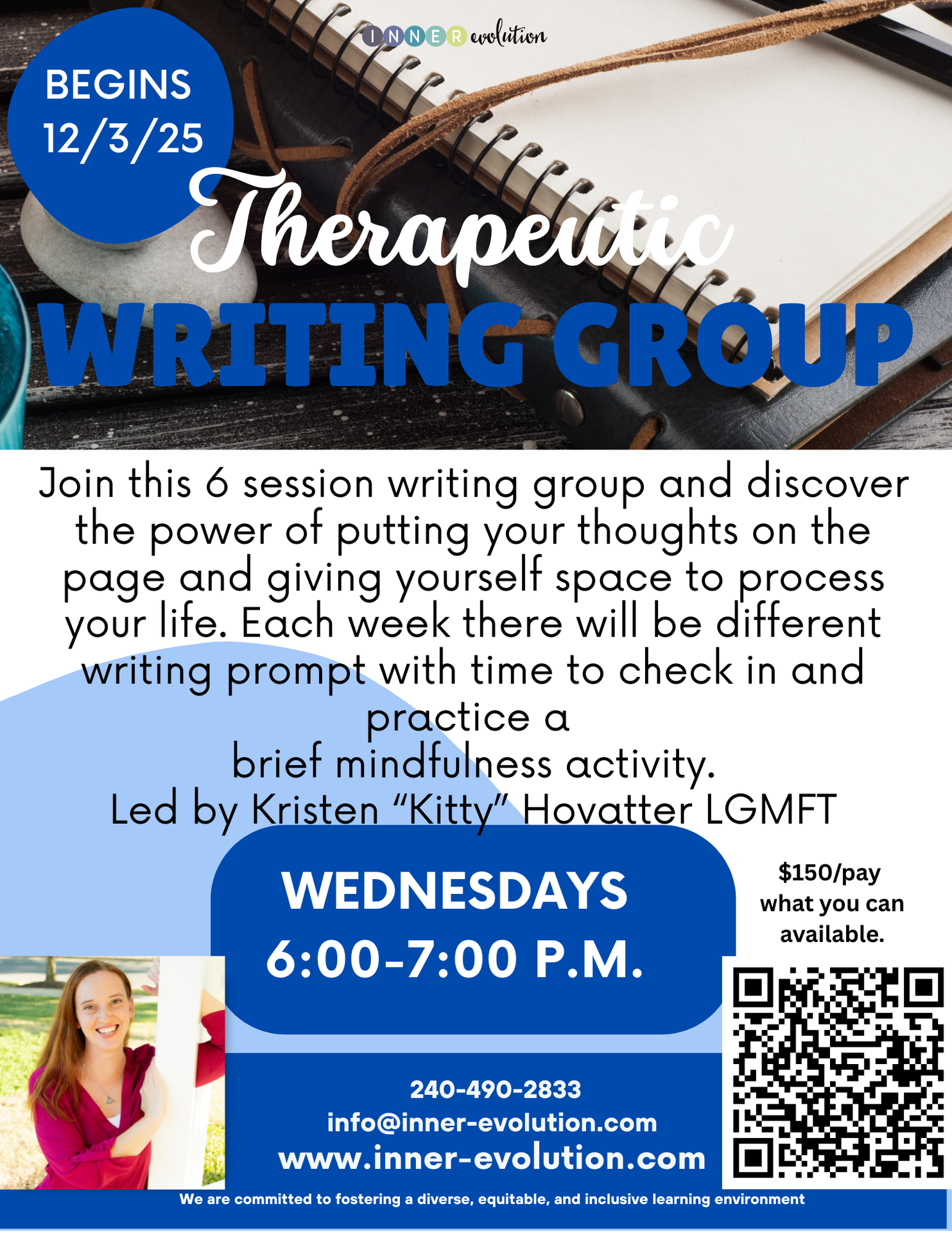 Discover the transformative power of writing with this summer! This group is designed for individuals seeking to explore their inner worlds, process emotions, and promote mental well-being through the practice of journaling. Join Kristen "Kitty" Hovatter LGMFT for this 6 week opportunity to build a writing practice in a supportive community!